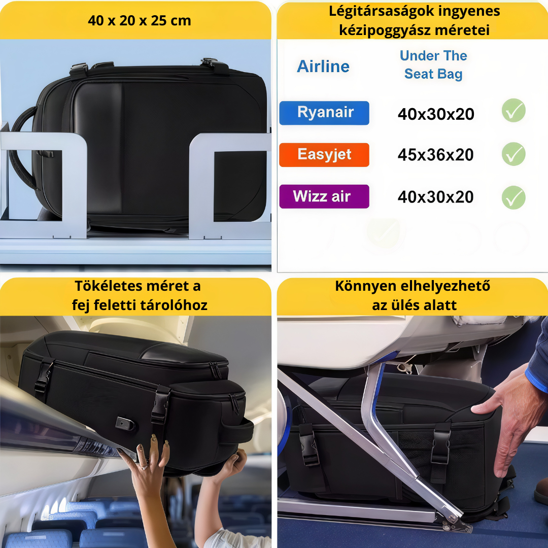 Könnyű tárolás és hordozás: A táska nemcsak a feletted lévő tárolóban, hanem az ülés alatt is könnyedén elfér, így nem kell aggódnod a helyhiány miatt.